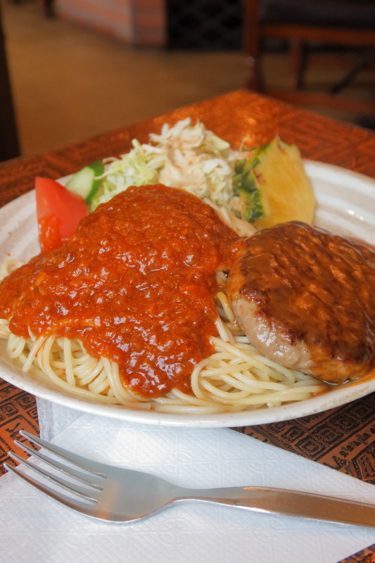 ミートソーススパゲッティとハンバーグがセットになっていてオトクな気分。