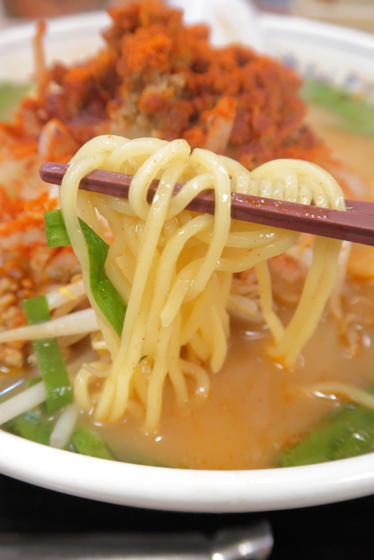満州ラーメンは真っ赤で激辛に見えますが、食べると旨辛レベル。