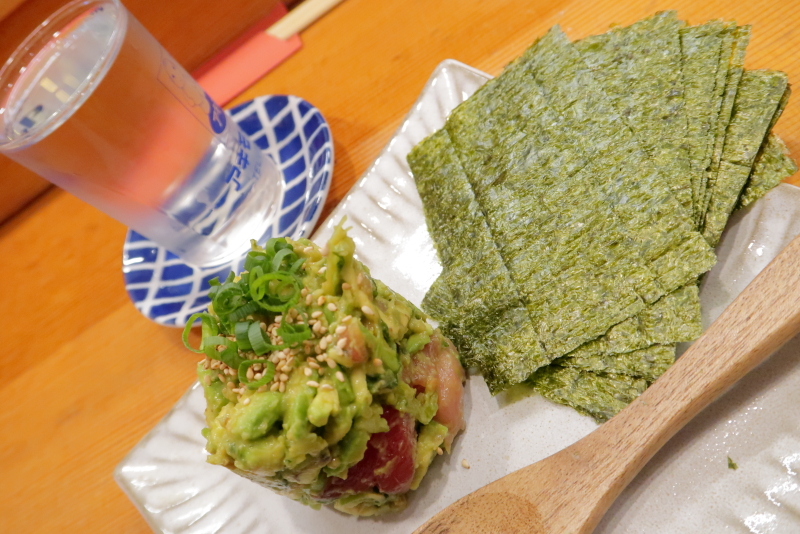 アボカドとマグロのなめろうを海苔で包んで食べます。