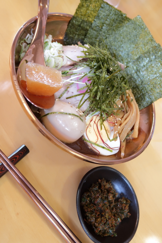 器とレンゲと箸がローズゴールドの金属製でインパクトあります。