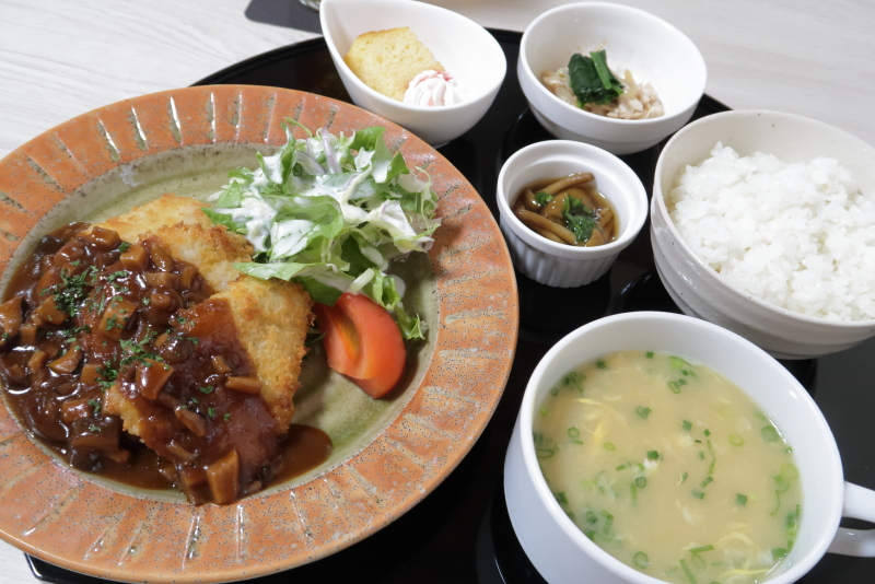 メインのカツレツのほか、ライス、カップスープ、小鉢2品、プチデザート、ドリンクがセット。
